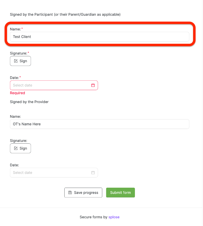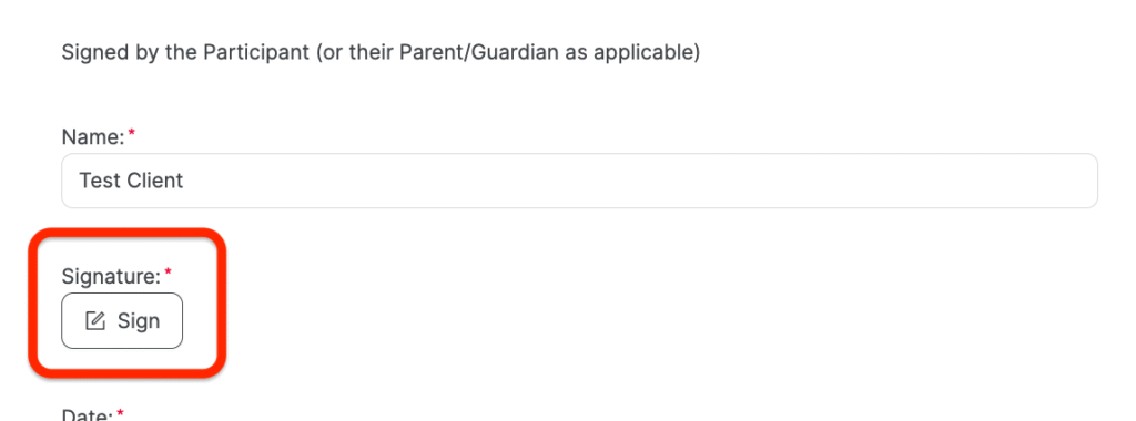 At the bottom of the service agreement, you will see a section called “Signed by the Participant (or their Parent/Guardian as applicable)”. We will have already entered your name in the “Name” field box.
